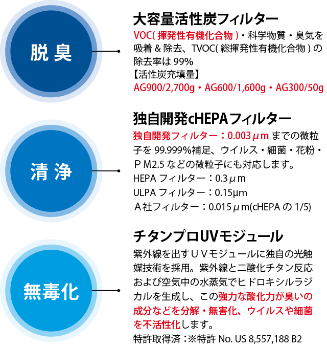 世界最高レベルの微粒子除去能力(0.003μmまで99.999%捕捉)を持つ独自のcHEPAフィルターと、臭いや有害ガスを分解する活性炭フィルター、