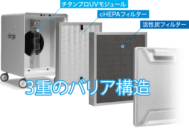 世界最高レベルの微粒子除去能力(0.003μmまで99.999%捕捉)を持つ独自のcHEPAフィルターと、臭いや有害ガスを分解する活性炭フィルター、